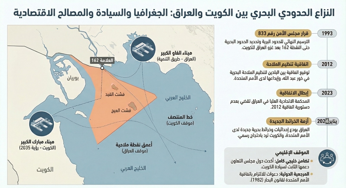 تُعد أزمة الخرائط الحالية بين العراق والكويت أحدث حلقة في سلسلة خلافات حدودية بحرية طويلة الأمد، تركز بشكل أساسي على خور عبد الله والحدود البحرية الممتدة بعد العلامة 162.