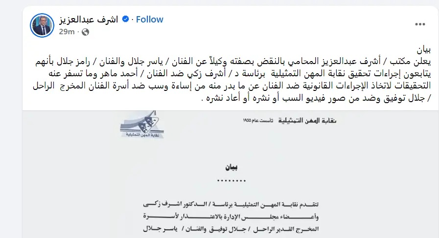 فقد أصدرت نقابة المهن التمثيلية برئاسة الدكتور أشرف زكي، وأعضاء مجلس الإدارة بيانا تقدموا من خلاله بالاعتذار لأسرة المخرج الراحل جلال توفيق والفنان ياسر جلال، والفنان رامز جلال عما بدر من الفنان أحمد ماهر.
