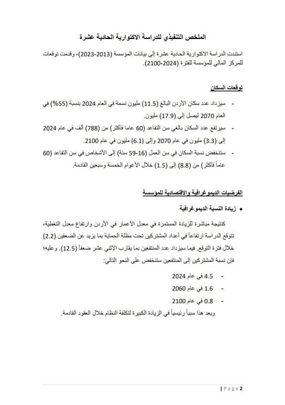 نشرت المؤسسة العامة للضمان الاجتماعي، على موقعها الإلكتروني الثلاثاء، نتائج الدراسة الاكتوارية الحادية عشرة، التي تُجرى كل 3 سنوات بموجب أحكام المادة (18) من قانون الضمان الاجتماعي.