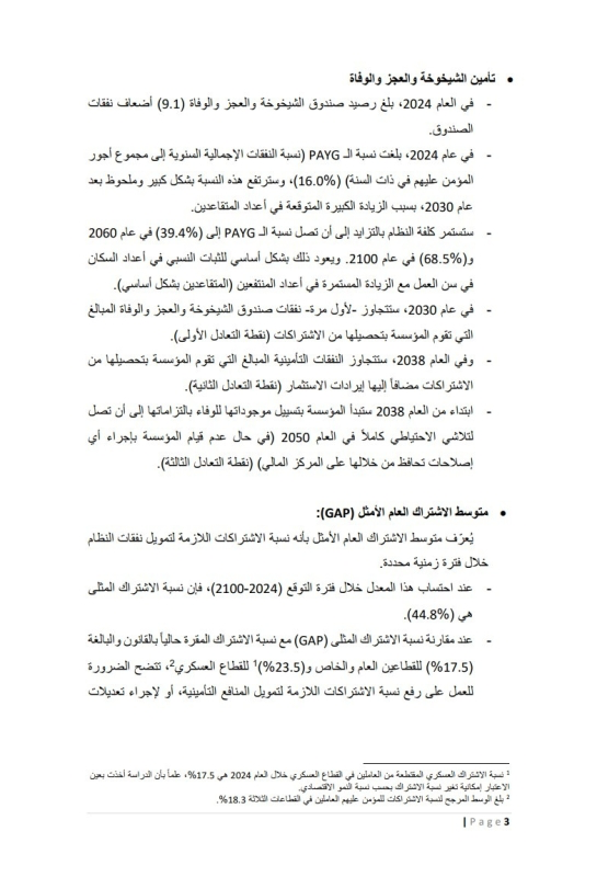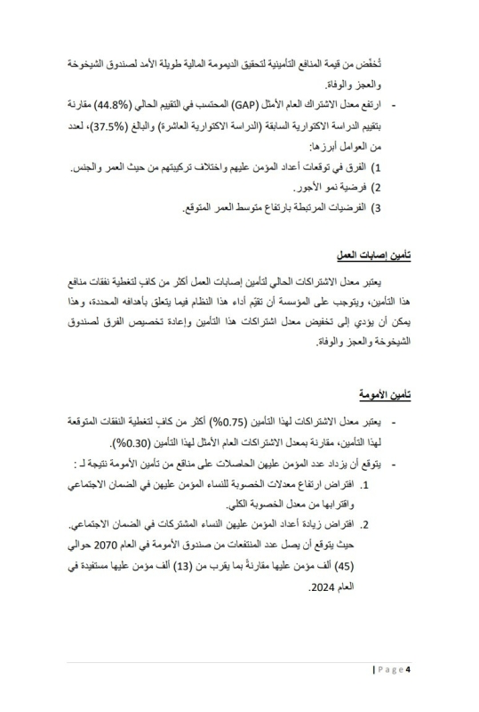وأشارت المؤسسة إلى أن تأمين الشيخوخة والعجز والوفاة يتمتع بوضع مالي جيد، إلا أن الدراسة أظهرت أن موجودات المؤسسة المقدّرة تقل عن عشرة أضعاف نفقاتها التأمينية للسنة العاشرة من تاريخ التقييم، الأمر الذي يستدعي تنفيذ الإصلاحات اللازمة للحفاظ على استدامته واستقراره المالي على المدى الطويل، بما يضمن استمراره في تقديم خدماته للأجيال القادمة والوفاء بالتزاماته.