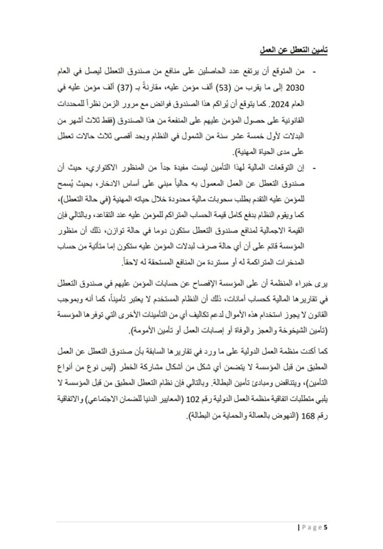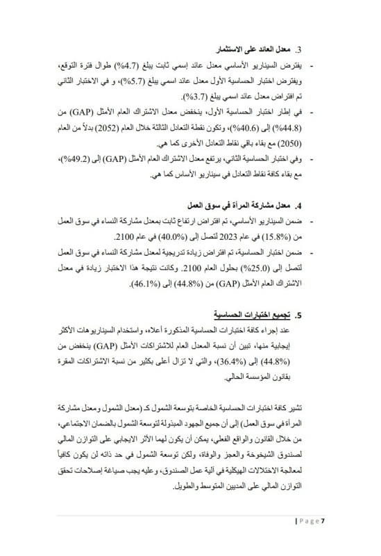 كما أوضحت أن نقطة التعادل الثانية متوقعة في عام 2038، وفيها تصبح الإيرادات التأمينية والعوائد الاستثمارية السنوية غير كافية لتغطية النفقات التأمينية المطلوبة، في حال لم يتحسن العائد على الاستثمار.