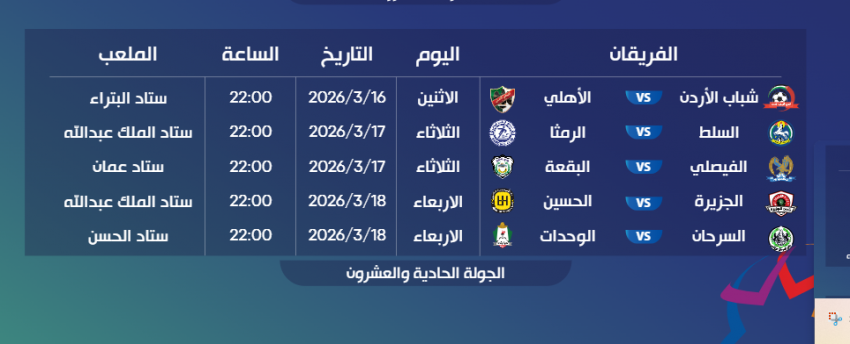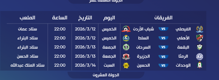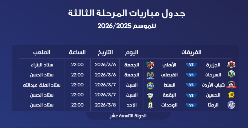 أصدر الاتحاد الأردني لكرة القدم، جدول مواعيد وأماكن إقامة مباريات الأسابيع من التاسع عشر وحتى الحادي والعشرين من بطولة الدوري الأردني للمحترفين لموسم 2025/2026.