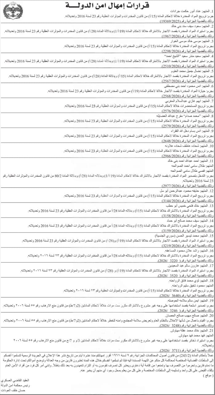 وأضاف القاضي العودات: "أمر كل فرد من أفراد الأمن العام بإلقاء القبض على كل متهم وتسليمه إلى السلطات المختصة، وعلى كل من يعلم بمكان أي منهم أن يبلغ عنه".