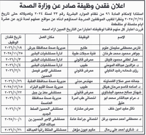 أعلنت وزارة الصحة عن فقدان عدد من الموظفين لوظائفهم، وذلك استناداً لأحكام المادة (96) من نظام إدارة الموارد البشرية رقم (33) لسنة 2024 وتعديلاته حتى تاريخ 24 فبراير 2025، وذلك بسبب التغيب غير المبرر عن مواقع العمل لمدة تزيد عن عشرة أيام، سواء كانت متصلة أو متقطعة.