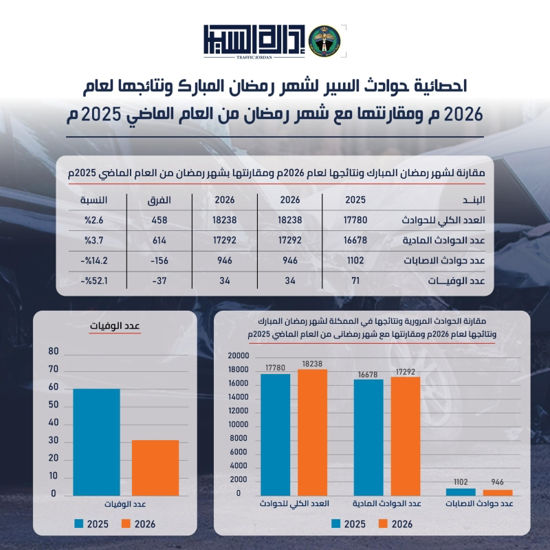 فعلى الرغم من ارتفاع الحوادث بنسبة 2.6%، انخفض عدد الوفيات بنسبة 52%، من 71 وفاةً في عام 2025 إلى 34 وفاةً في عام 2026.