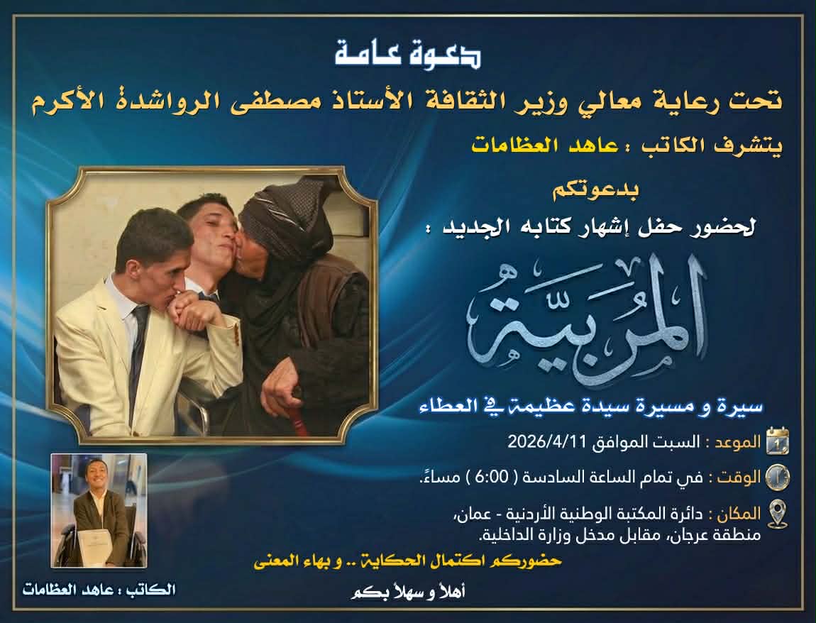 يستعد الكاتب عاهد العظامات لإقامة فعاليّة إشهار كتابه الجديد "المُربّية ". تحت رعاية وزير الثقافة الأستاذ مصطفى الرواشدة. والتي ستُقام في دائرة المكتبة الوطنية الأردنية في تمام الساعة السادسة من مساء يوم السبت الموافق تاريخه ١١/٤/٢٠٢٦