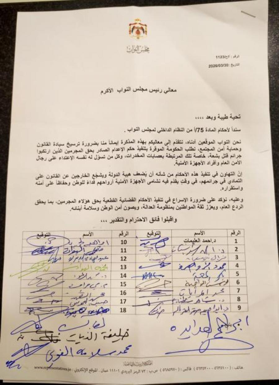 تبنّى النائب الدكتور أحمد العليمات مذكرة نيابية دعا من خلالها الحكومة إلى الإسراع في تنفيذ أحكام الإعدام بحق مرتكبي جرائم القتل، لا سيما تلك المرتبطة بالمخدرات والاعتداء على رجال الأمن.