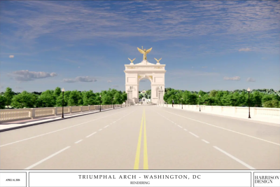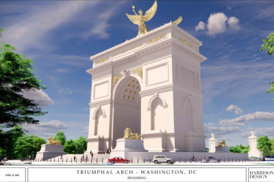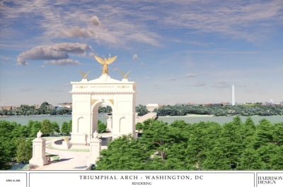 ويشبه القوس قوس النصر التاريخي في فرنسا، الذي يبلغ ارتفاعه 164 قدما، وسيُقام على الضفة المقابلة لنهر بوتوماك من نصب لينكولن التذكاري، الذي يبلغ ارتفاعه نحو 100 قدم.