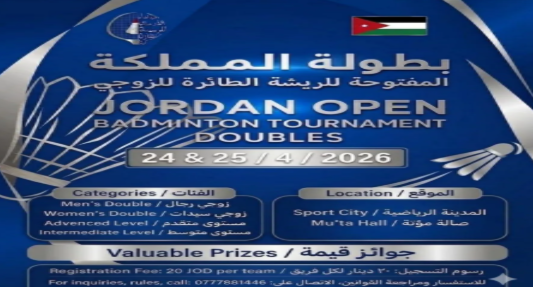 أعلن الاتحاد الأردني للريشة الطائرة عن تنظيم بطولة المملكة المفتوحة للزوجي، والتي ينتظر أن تشهد مشاركة واسعة من اللاعبين واللاعبات من مختلف المستويات.