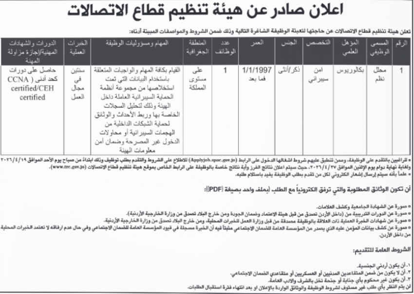 أعلنت هيئة تنظيم قطاع الاتصالات، الأحد، عن توفر وظيفة شاغرة لديها، وفق شروط ومواصفات محددة.