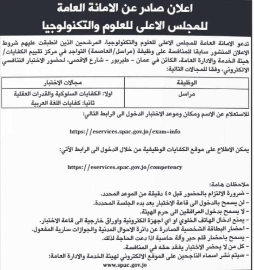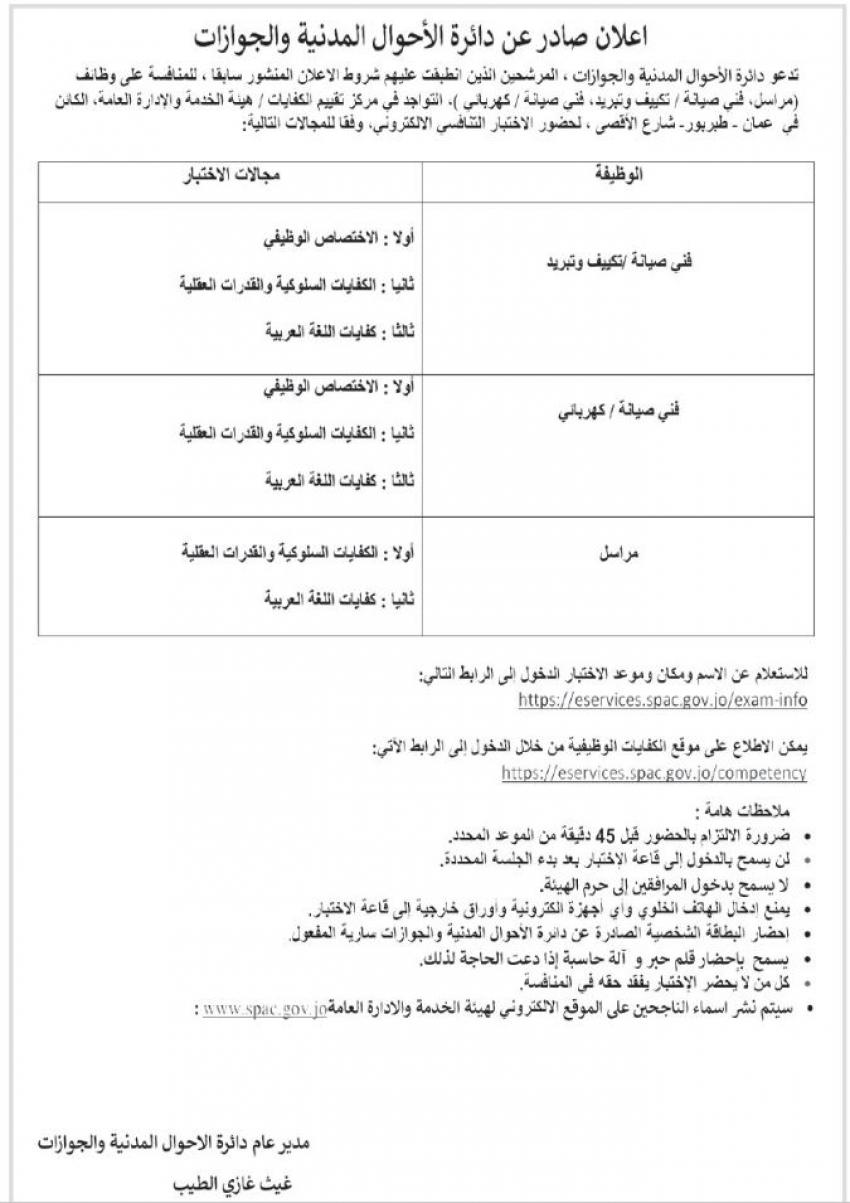 كما دعت دائرة الأحوال المدنية والجوازات والمجلس الأعلى للعلوم والتكنولوجيا، المرشحين الذين انطبقت عليهم شروط إعلانات المنافسة السابقة، إلى التقدم للاختبار التنافسي لشغل عدد من الوظائف.