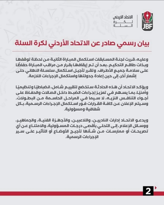 يتابع الاتحاد الأردني لكرة السلة، ببالغ الأسف والاستياء، الأحداث المؤسفة التي رافقت المباراة الثانية من سلسلة نهائي دوري CFI الممتاز للرجال بين ناديي الفيصلي واتحاد عمان، والتي لا تمت بصلة إلى قيم اللعبة ولا تعكس الروح الرياضية التي يجب أن تسود ملاعبنا.