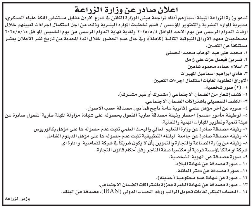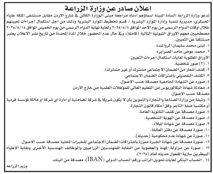 أعلنت وزارة الزراعة عن دعوة عدد من المرشحين المدرجة أسماؤهم أدناه لمراجعة مبنى الوزارة الكائن في شارع الأردن مقابل مستشفى الملكة علياء العسكري – مديرية تنمية وإدارة الموارد البشرية / قسم تخطيط الموارد البشرية، وذلك لاستكمال إجراءات تعيينهم في وظائف "مهندس زراعي" و"مأمور مقسم"، خلال أوقات الدوام الرسمي ابتداءً من يوم الأحد الموافق 4 أيار 2025، ولغاية نهاية دوام يوم الخميس الموافق 15 أيار 2025.
