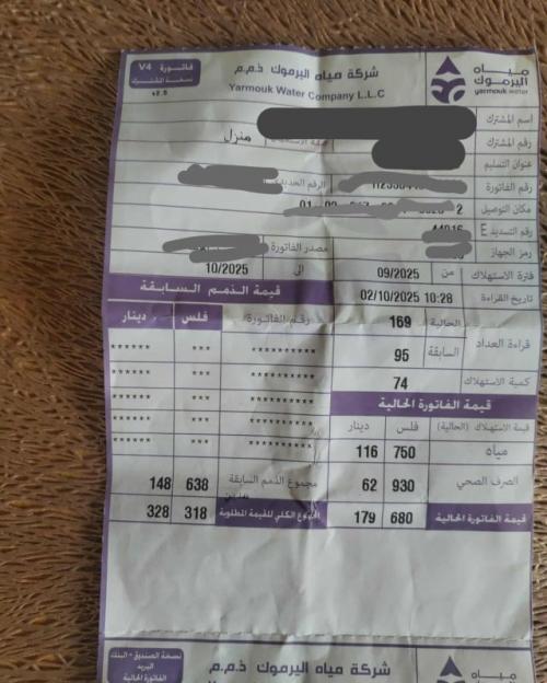 تفاجأ أحد المواطنين القاطنين في حي التركمان بمدينة إربد شمالي الأردن، بصدور فاتورة المياه الصادرة عن شركة مياه اليرموك لشهر أيلول، بلغت قيمتها 179 دينارا، قافزة من معدل 5 دنانير ونصف لفواتيره الشهرية المعتادة.