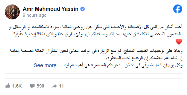 وأضاف أن قرار منع الزيارة جاء بناءً على توجيهات الأطباء، مشيراً إلى أن الحالة الصحية لزوجته مستقرة، وتتحسّن تدريجياً، داعياً الجميع إلى الاستمرار في الدعاء لها، مؤكداً أن"الدعاء هو أعظم دعم يمكن أن تقدّمه المحبة في هذه الظروف".