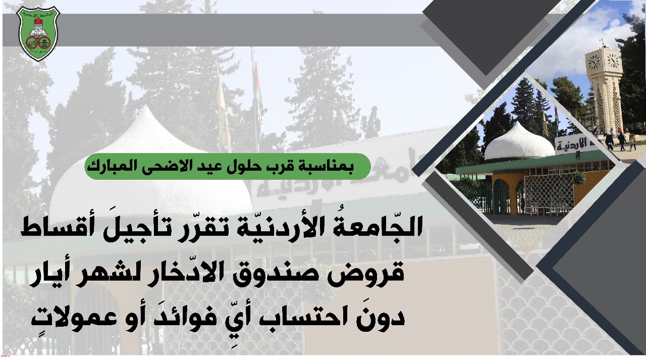قرّر رئيسُ الجامعة الأردنيّة الدكتور نذير عبيدات تأجيلَ أقساط جميع قروض صندوق الادّخار عن شهر أيار لهذا لعام 2025، بمناسبةِ حلول عيد الأضحى المبارك.ويشملُ القرارُ جميعَ العاملين...
