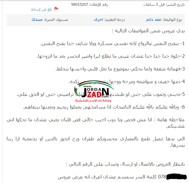 خاص - نشر مواطن اردني اعلانا عبر موقع "السوق المفتوح" يطلب فيه عروسا تحت شروط وبنود خاصة وضعها .
