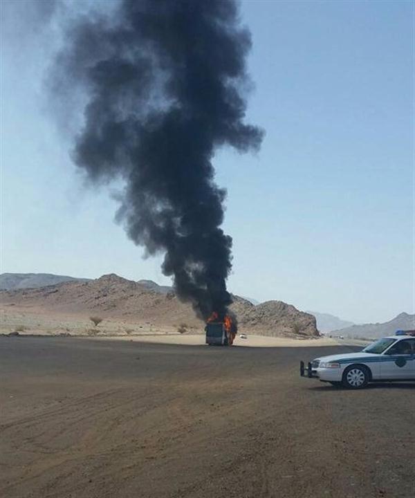 وعمل السائق على الفور بإخراج المعتمرين من الحافلة عقب اندلاع النيران في المحرك وقبيل وصولها إلى جميع أجزاء الحافلة.