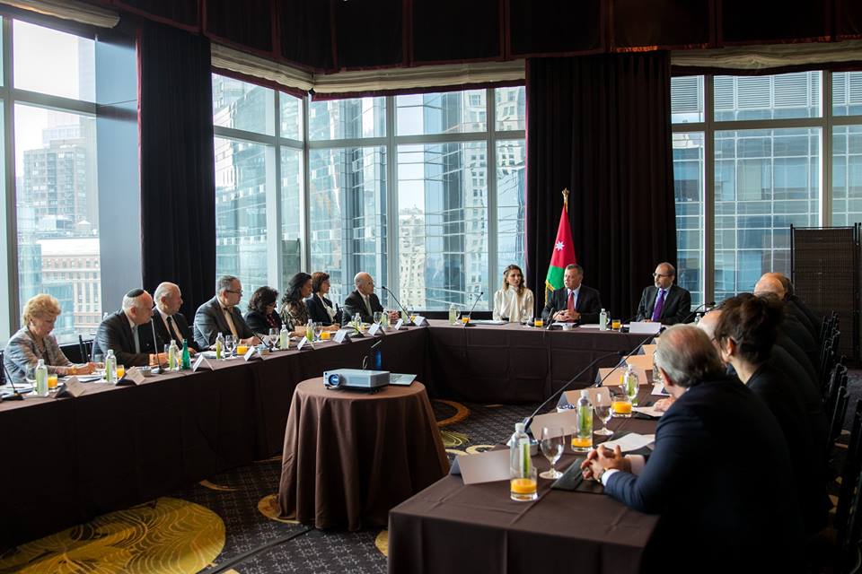 التقى جلالة الملك عبدالله الثاني، بحضور جلالة الملكة رانيا العبدالله، في نيويورك اليوم الأحد، عددا من ممثلي المنظمات اليهودية الأمريكية، في اجتماع جرى خلاله استعراض جهود تحريك عملية السلام، وتطورات الأوضاع في المنطقة.