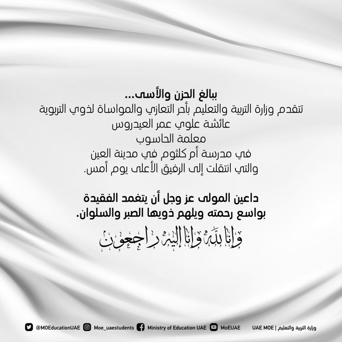 ونعت وزارة التربية والتعليم المعلمة الراحلة على حسابها الرسمي بـ"تويتر" قالت فيه: "ببالغ الحزن والأسى.. تتقدم وزارة التربية والتعليم بأحر التعازي والمواساة لذوي التربوية عائشة علوي عمر العيدروس، معلمة الحاسوب في مدرسة أم كلثوم في مدينة العين.