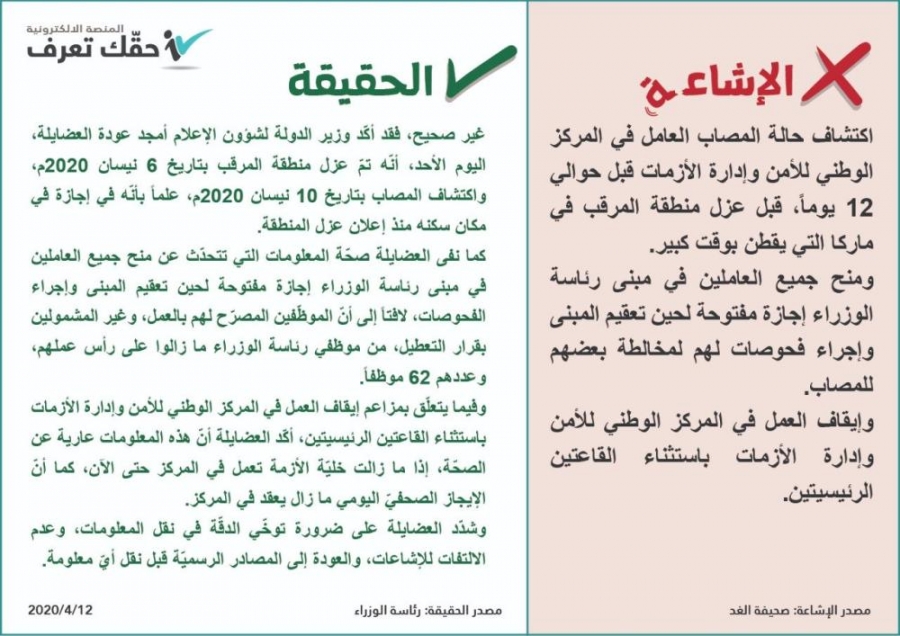 كما نفت إيقاف العمل في المركز الوطني للأمن وإدارة الأزمات، ومنح العاملين برئاسة الوزراء إجازة مفتوحة لحين تعقيم المبنى واجراء فحوصات لهم لمخالطة بعضهم للمصابين