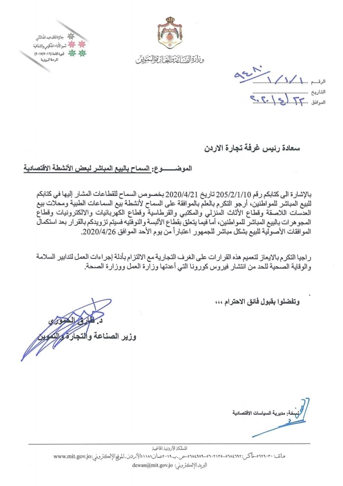 وبحسب الوثيقة، التي اطلعت عليها "خبرني"، فإن وزارة الصناعة والتجارة والتموين، ستزود غرفة تجارة الأردن، بقرار يخص البيع المباشر لقطاع الملابس والنوفتيه، الأحد.