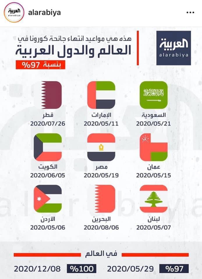 نشرت قناة العربية تواريخ قالت إنها مواعيد انتهاء جائحة كورونا في العالم والدول العربية بنسبة 97 بالمائة.
