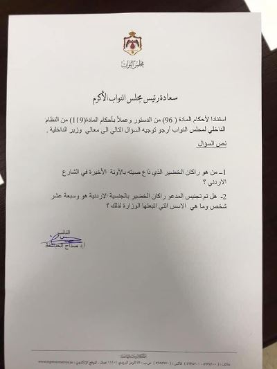 وجه النائب صداح الحباشنة، الخميس، سؤالا إلى وزير الداخلية، من خلال رئيس المجلس عاطف الطراونة، حول راكان خضير الذي ذاع صيته أخيرا.