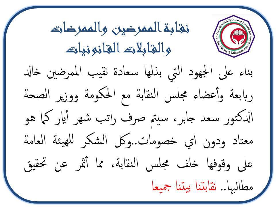 أعلنت نقابة الممرضين أنه سيتم صرف راتب شهر أيار للعاملين في الصحة من الكوادر الطبية والتمريضية دون خصومات.