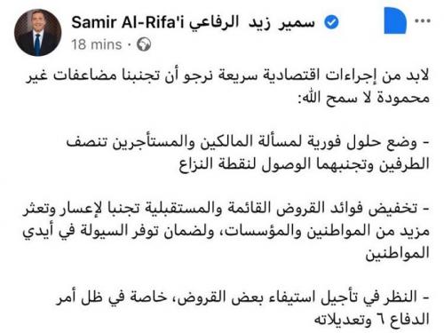 دعا رئيس الوزراء الاسبق العين سمير الرفاعي الى اتخاذ إجراءات اقتصادية سريعة تجنب المملكة مضاعفات غير محمودة على اثر ازمة وباء فيروس كورونا.