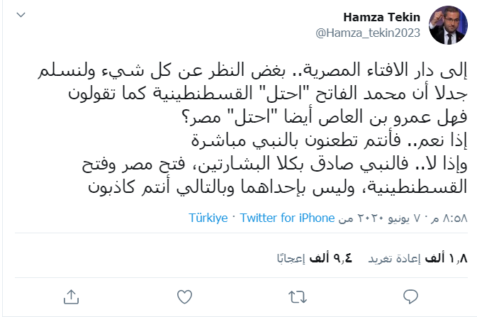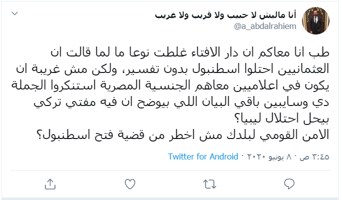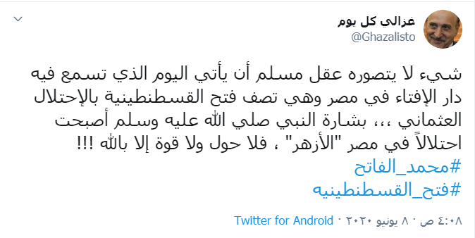 وأثار هذا الوصف حالة من الجدل في صفوف المصريين خاصة والمسلمين عامة، بسبب ما يعتبره الكثيرون منهم أن دخول العثمانيين إلى القسطنطينية هو "فتح عظيم" وقد بشّر به نبي الإسلام محمد، وواحد من أبرز المحطات في التاريخ عند المسلمين.