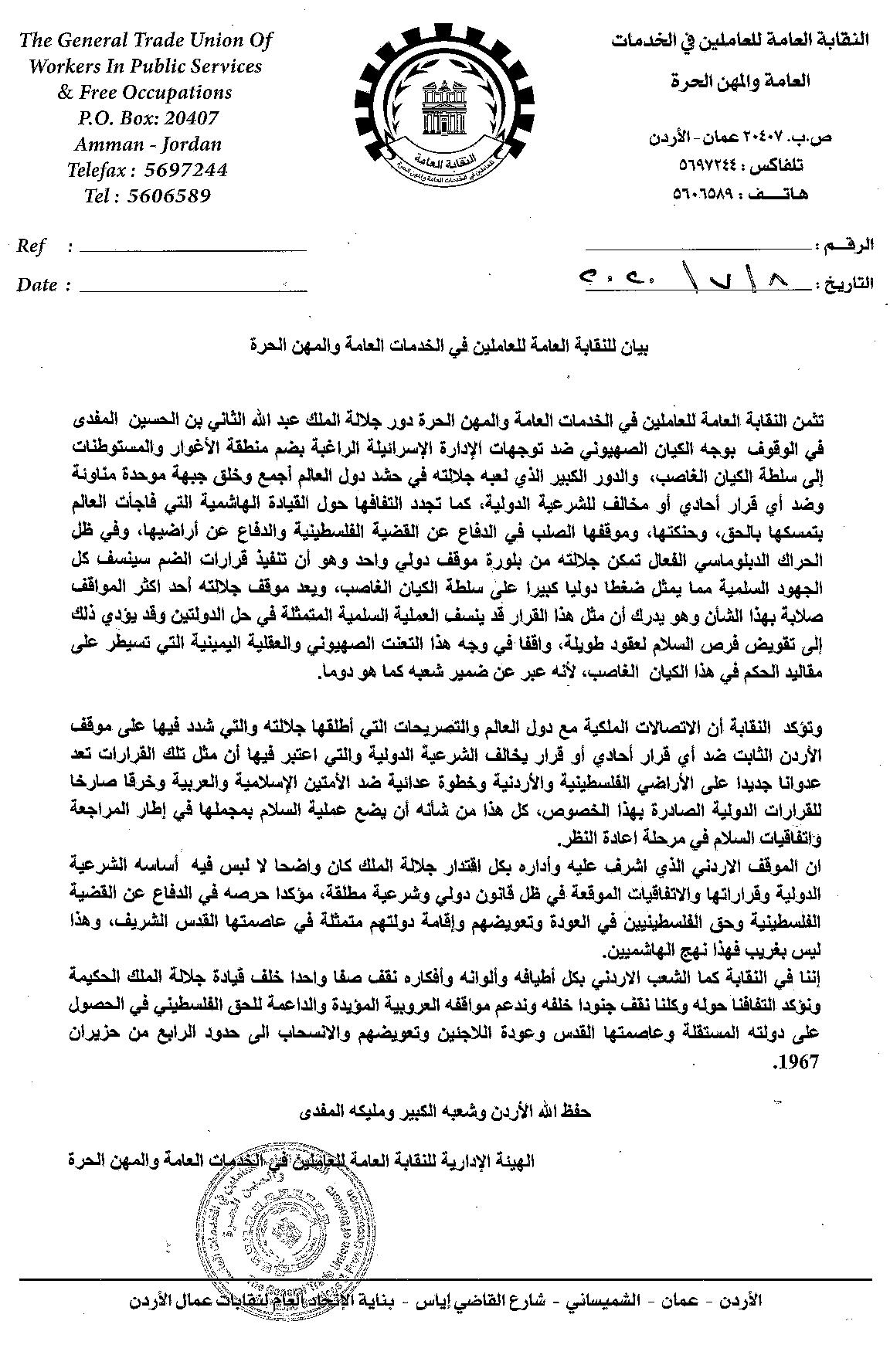 إننا في النقابة كما الشعب الاردني بكل أطيافه وألوانه وأفكاره نقف صفا واحدا خلف قيادة جلالة الملك الحكيمة ونؤكد التفافنا حوله وكلنا نقف جنودا خلفه وندعم مواقفه العروبية المؤيدة والداعمة للحق الفلسطيني في الحصول على دولته المستقلة وعاصمتها القدس وعودة اللاجئين وتعويضهم والانسحاب الى حدود الرابع من حزيران 1967.