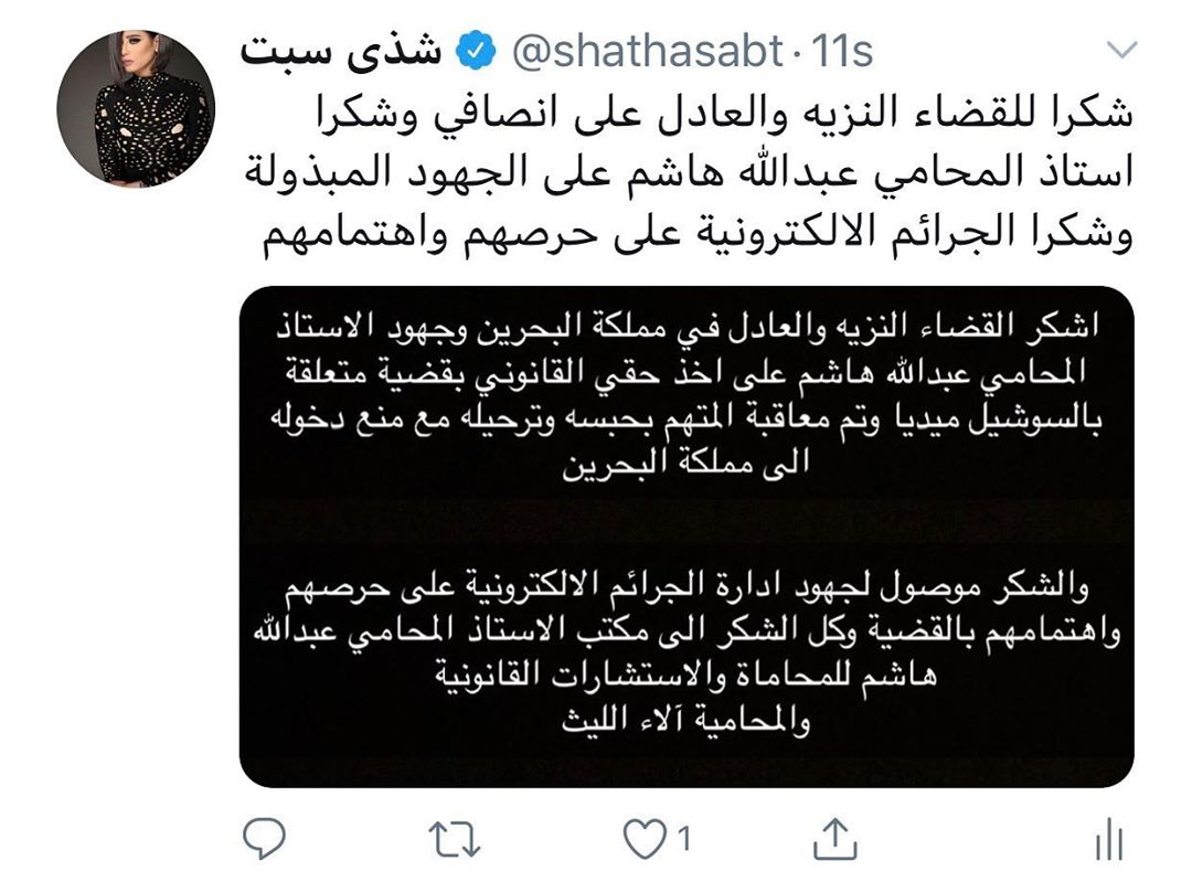 " اللهم لك الحمد والشكر.. من لا يشكر الناس لا يشكر الله.. أشكر القضاء النزيه والعادل في مملكة البحرين وجهود الأستاذ المحامي عبدالله هاشم على أخذ حقي القانوني بقضية متعلقة بالسوشيال ميديا".
