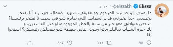 وقالت إليسا في تغريدتها: "ما بصدق إنو حد ترند المرحوم جو عقيقي، شهيد الإهمال، في ترند أنا بفتخر برئيسي، حدا يخبرني قدام المصايب اللي صايرة شو في سبب تا نفتخر برئيسنا؟ شخص متواطئ معو خبر من سنة بالخطر الموجود متلو متل الفاسدين".