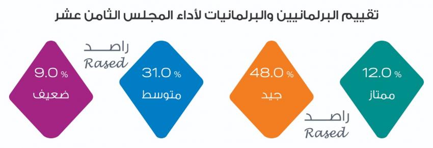 وفيما يتعلق بتقييم البرلمانيين والبرلمانيات لأداء مجلس النواب الثامن عشر، فقد قال ما نسبته 12% أن أداء المجلس كان ممتازاً، بينما كان رأي 48% من النواب أن أداء المجلس كان جيداً، فيما قال 31٪ أن أداء المجلس كان متوسطاً، وعبر 9% عن رأيهم بأن أداء المجلس كان ضعيفاً.