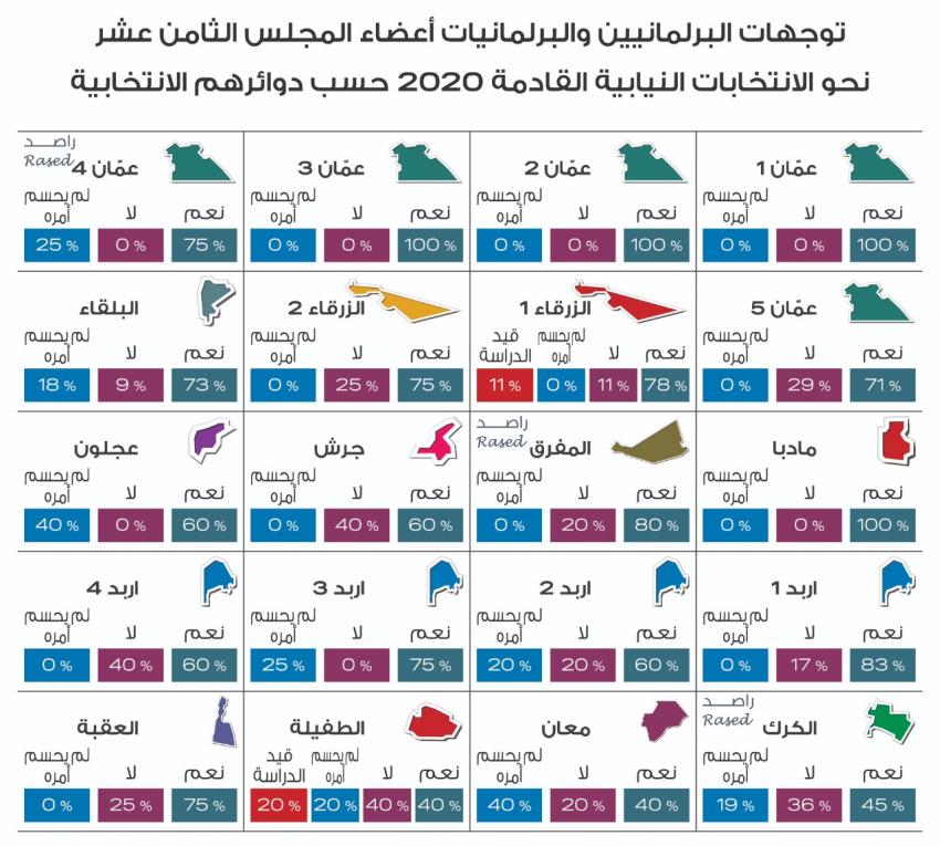 وأظهرت النتائج أن نواب الدوائر الانتخابية العاصمة الاولى والثانية والثالثة وبدو الشمال وبدو الوسط ومادبا ينون الترشح بنسبة 100% من نواب الدائرة تلاهم نواب اربد الأولى بنسبة 83%، فيما كان نواب الطفيلة ومعان الأقل رغبة بالترشح بنسبة 40% لكل منهما، وأكد معظم أعضاء حزب جبهة العمل الإسلامي نواب “كتلة الإصلاح” رغبتهم بالترشح لكنهم ربطوا قرارهم بقرار الحزب.