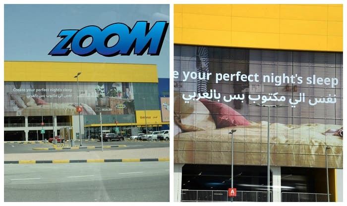 وبحسب الصور المتداولة، فقد وضعت الشركة على المبنى الخاص بها إعلانًا يقول باللغة الإنجليزية Create your perfect night's sleep، وهي تعنى باللغة العربية، "هيئ نومك المثالي ليلًا"، لكن تحت العبارة كتب باللغة العربية جملة "نفس الي مكتوب بس بالعربي".