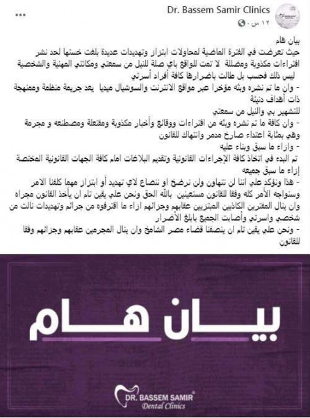 وفي أول تعليق لطبيب الأسنان باسم سمير على هذا الاتهام، نشر بيان رسمي على صفحته بموقع (فيس بوك) ونقلته (جلولي)، قال فيه: "بيان هام :حيث تعرضت في الفترة الماضية لمحاولات ابتزاز وتهديدات عديدة بلغت خستها لحد نشر افتراءات مكذوبة ومضللة لا تمت للواقع بأي صلة للنيل من سمعتي ومكانتي المهنية والشخصية ليس ذلك فحسب بل طالت باضرارها كافة أفراد أسرتي".