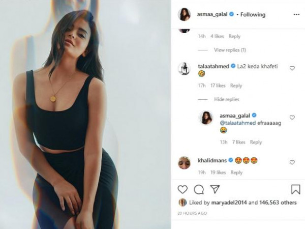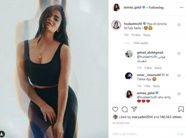 نشرت "أسماء" صورة لها ظهرت من خلالها بإطلالة أنثوية أظهرت جمالها، نشرتها دون تعليق، لكن الصورة لاقت إعجاب الكثير من صديقاتها، بينهم الفنانة هدى المفتي التي علقت قائلة: "هي الكورونا بتحلي كدا"، لترد عليها "أسماء": "أهو أنتي"، وفقاً لـ(هُن).