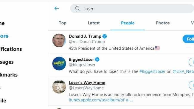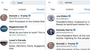 وبعد خسارة "ترامب"، فوجئ مستخدمو موقع التدوين "تويتر" الباحثون عن كلمة "خاسر" بنتيجة أولى غير معتادة السبت، وهي حساب الرئيس الأميركي "دونالد ترامب".