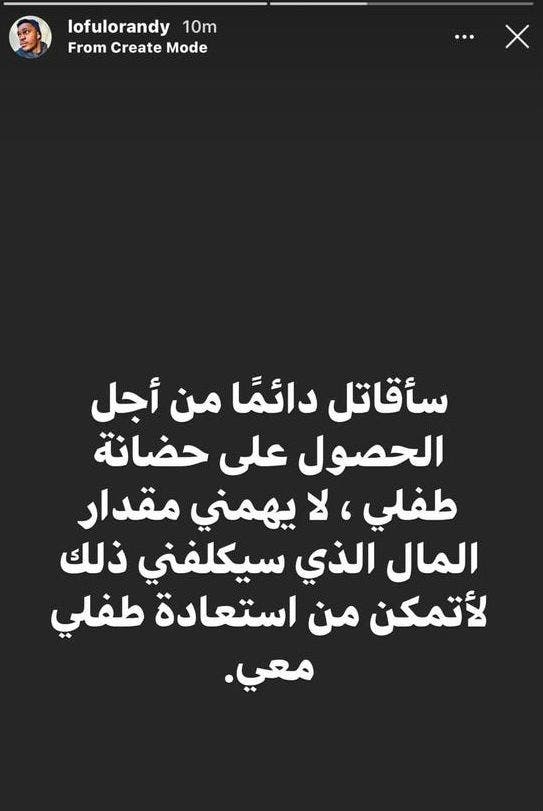 كما أضاف من خلال تعليق آخر عن ابنته حيث قال أنه لن يتخلى عن حضانة ابنته مهما كلّف الأمر وسوف يقاتل من أجل تربية ابنته حيث قال: "سأقاتل دائمًا من أجل الحصول على حضانة طفلي، لا يهمني مقدار المال الذي سيكلفني ذلك لأتمكن من استعادة طفلي معي".
