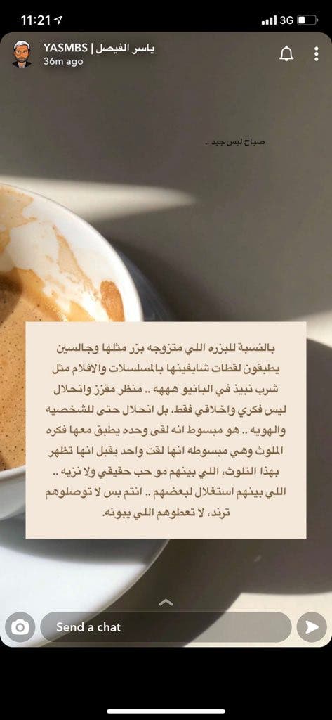 وهاجم الناقد السعودي ياسر الفيصل أيضاً الثنائي بمنشور جاء فيه: "بالنسبة للبزرة الي متجوزة بزر مثلها وجالسين يطبقون لقطات شايفينها بالمسلسلات والأفلام مثل شرب نبيذ بالبانيو.. منظر مقزز وانحلال أخلاقي وفكري والشخصية والهوية.. وهو مبسوط لقى وحدة يطلق معها فكرة الملوث وهي مبسوطة لقت واحد تطلق معه فكرة التلوث والي بينهم مو حب حقيقي ونزيه.. الي بينهم استغلال لبعض"