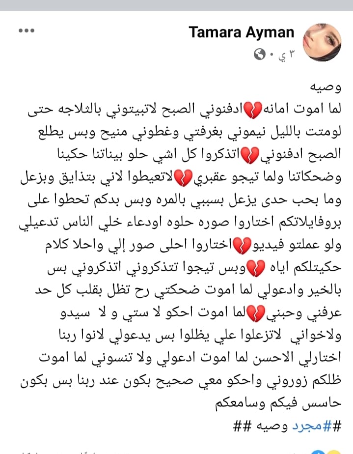 حكاية تمارا كان يتابعها أصدقاؤها عبر المنشورات التي كانت تكتبها عبر صفحتها الشخصية في الفيسبوك، لتكون وصيتها قبل يومين من وفاتها هي آخر ما كتبته ، ودعت فيه الجميع وطلبت منهم الدعاء لها.