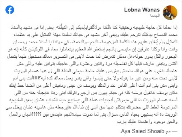 وقالت لبنى ونس عبر حسابها الشخصي على تطبيق التواصل الإجتماعي (فيس بوك): "إذا عملنا كل حاجة طبيعية وحقيقية كنا هَلَكنا، ولا تُلقوا بأيديكم إلى التهلُكه، يعنى إذا في مشهد يا أستاذ محمد التمساح بياكلك نترحم عليك ويبقى آخر مشهد في حياتك تعلمنا مهنة التمثيل على يد عظماء التمثيل ولم يُطلق عليهم هذه الكلمة المزعومة النجم والنجمة".