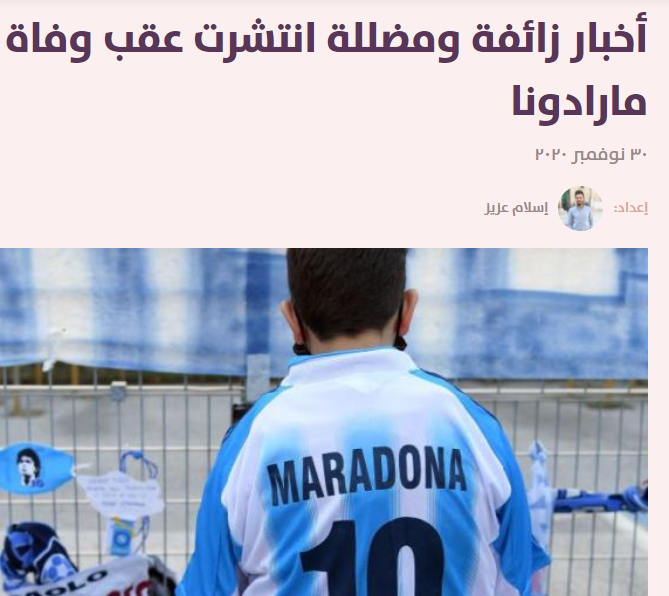 وما يزال اللاعب الأرجنتيني دييغو مارداونا مادةً للأخبار الكاذبة والإشاعات حتى بعد وفاته، إذ تداولت حسابات وصفحات على مواقع التواصل الاجتماعي، منذ نهاية شهر نوفمبر/تشرين الثاني الفائت، قصة عن كيفية شراء نادي نابولي الإيطالي، الذي يعوزه المال، دييغو مارادونا. إذ قال ناشرو القصة إنّ رئيس النادي طلب دعمًا ماليًا من عمدة المدينة لشراء مارادونا ولكنه تردد في الموافقة، ما دعا الجماهير إلى تشكيل صندوق اكتتاب شعبي نجح في إتمام الصفقة مقابل سبعة ملايين جنيه إسترليني. وهو ما أظهر تحقق "مسبار" أنه زائف.