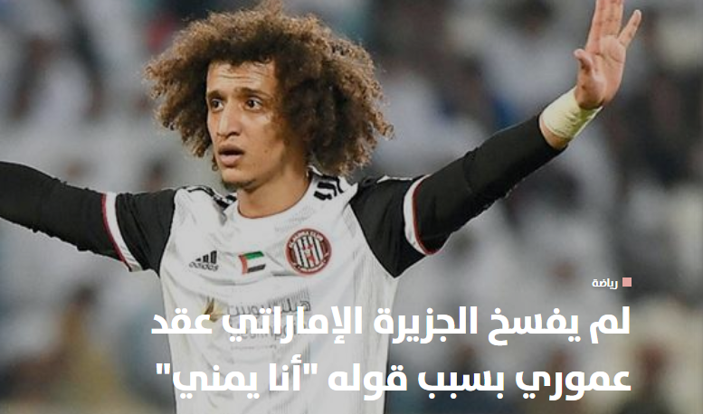 تداولت حسابات وصفحات على مواقع التواصل الاجتماعي، خبرًا مفاده أن نادي الجزيرة الإماراتي أعلن عن إنهاء تعاقده مع اللاعب عمر عبد الرحمن الشهير بـ "عموري"، والسبب أن اللاعب قال "أنا يمني"، وهو ما وجده "مسبار" مضللًا.