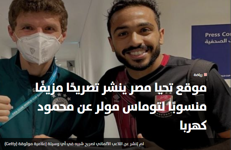 ونشرت مواقع إعلامية تصريحًا مزيفًا منسوبًا للاعب بايرن ميونيخ الألماني توماس مولر عن محمود كهربا، عقب فوز نادي بايرن ميونيخ على الأهلي المصري ضمن بطولة كأس العالم للأندية، قال فيه "لقد طلب محمود كهربا تبادل القمصان فوافقت كما أفعل دومًا، وتصورت بقميصه بطلب من مسؤول صفحتنا الناطقة بالعربية، ولم أكن أعلم من هو قبل مباراة الأمس"، وهو ما وجده "مسبار" زائفًا.
