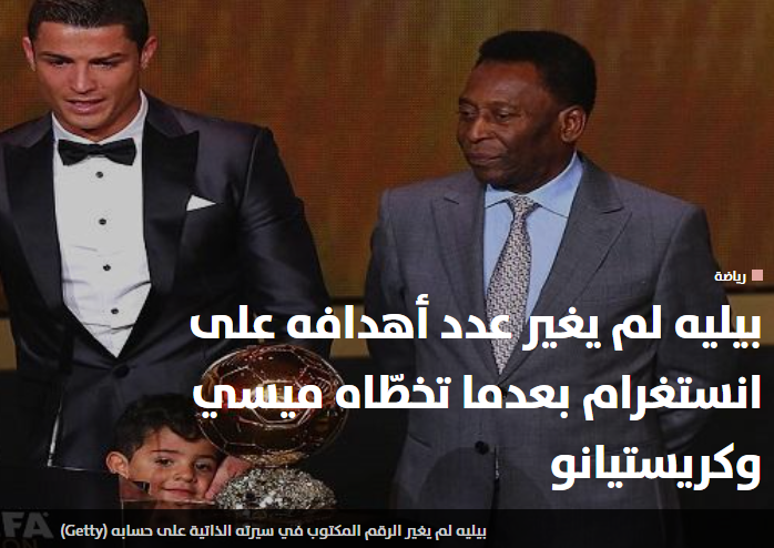وادعت صفحات على مواقع التواصل الاجتماعي أن لاعب كرة القدم البرازيلي السابق بيليه، غير عدد أهدافه على "انستغرام" بعدما تخطّاه ميسي وكريستيانو، وهو ما تحقق منه "مسبار" وتبيّن أنه زائف، إذ لم يغيّر بيليه الرقم المكتوب في سيرته الذاتية على حسابه في "انستغرام" مؤخرًا. كما نفى اللاعب البرازيلي السابق الأمر في تغريدة له على "تويتر".