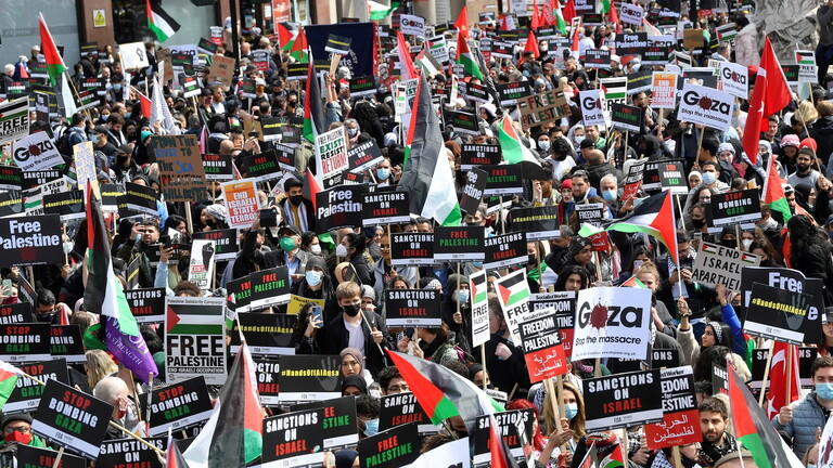 تظاهر الآلاف في لندن ومدن بريطانية أخرى اليوم السبت دعما للفلسطينيين واحتجاجا على ضربات جوية إسرائيلية على قطاع غزة خلال القتال مع حركة المقاومة الإسلامية "حماس".