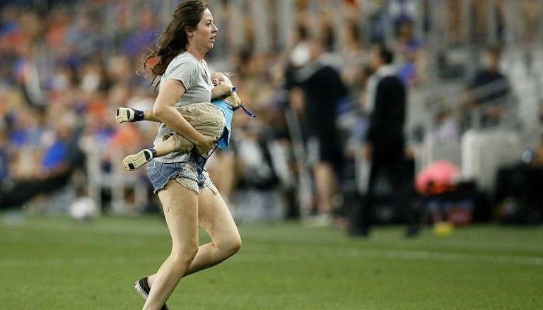 وقبل دخول الأم إلى أرض الملعب، حاول الحكم الرابع الدخول لمراجعة ما حدث، قبل أن تنجح الأم في حمل طفلها سريعاً والخروج به من المستطيل الأخضر.